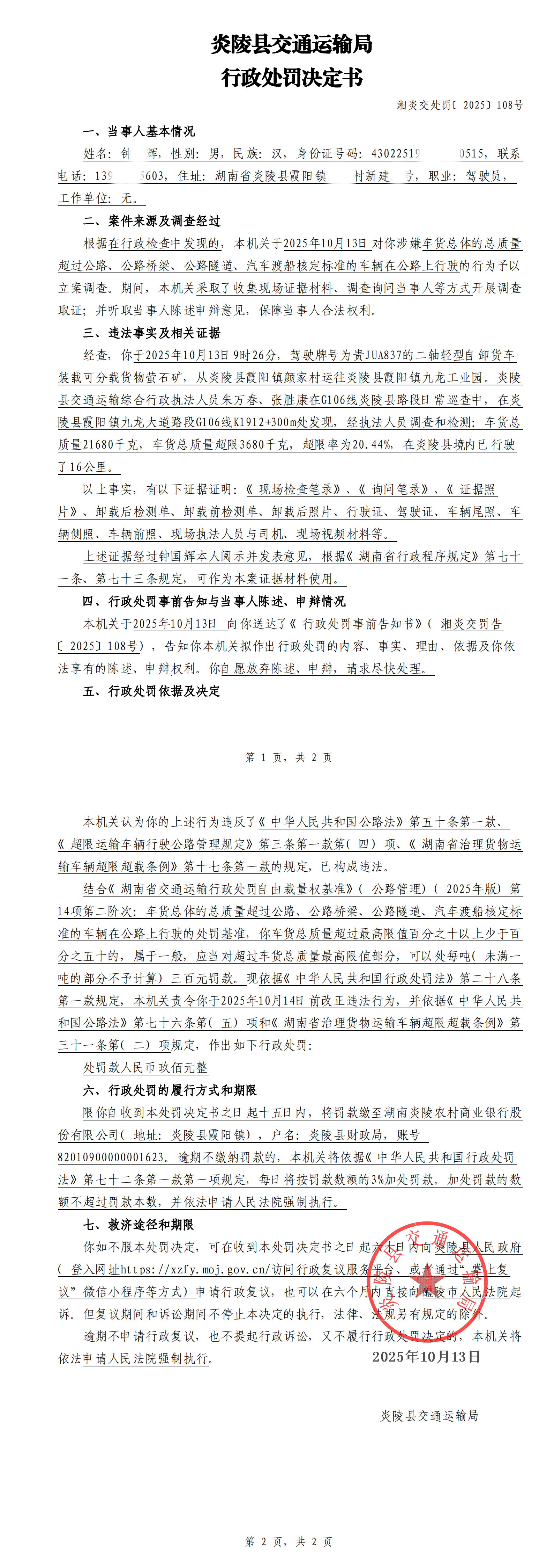 炎陵县交通运输局行政处罚决定书湘炎交处罚〔2025〕108号