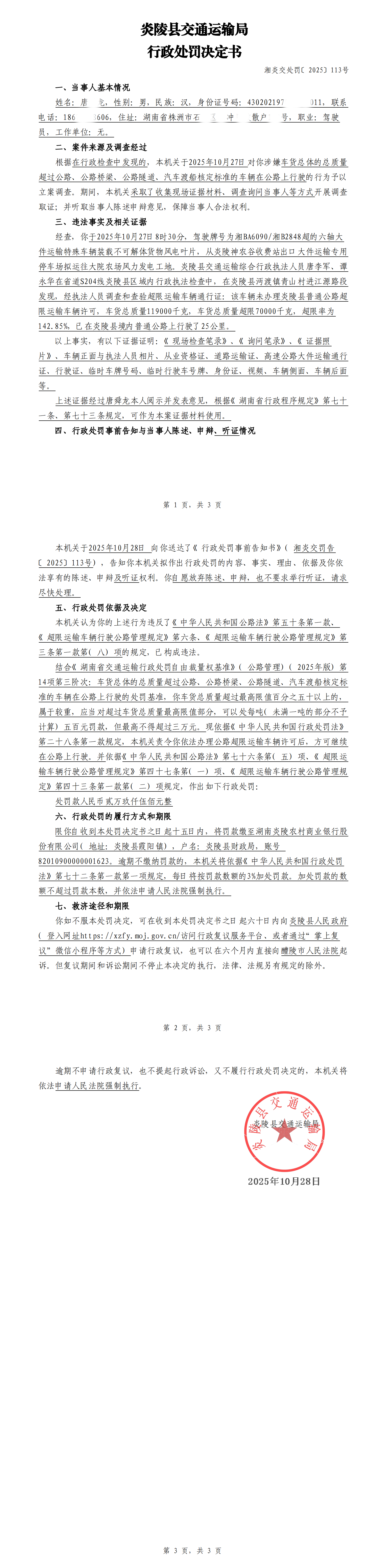 炎陵县交通运输局行政处罚决定书湘炎交处罚〔2025〕113号