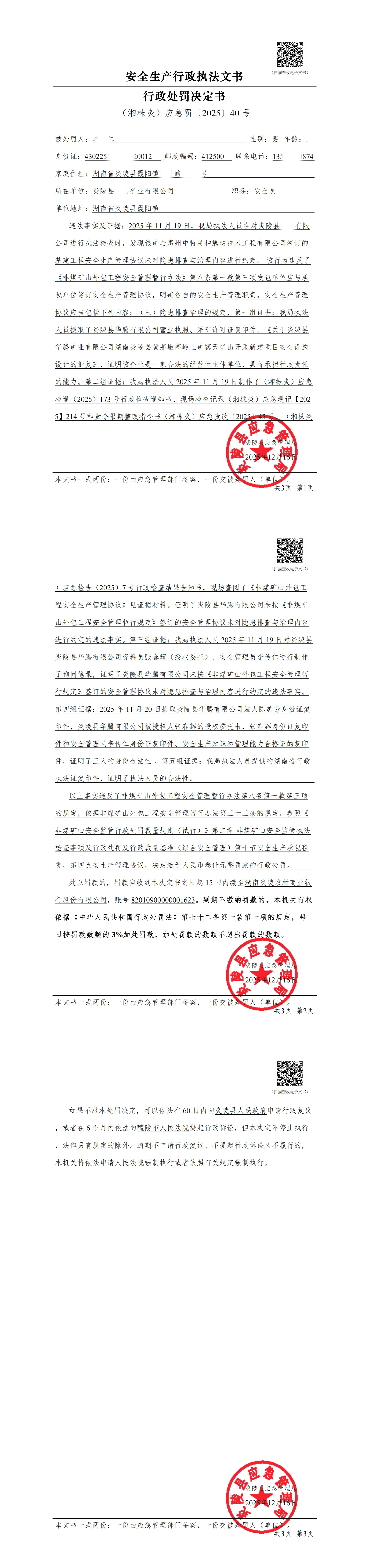 炎陵县应急管理局行政处罚决定书(湘株炎)应急罚〔2025〕40号