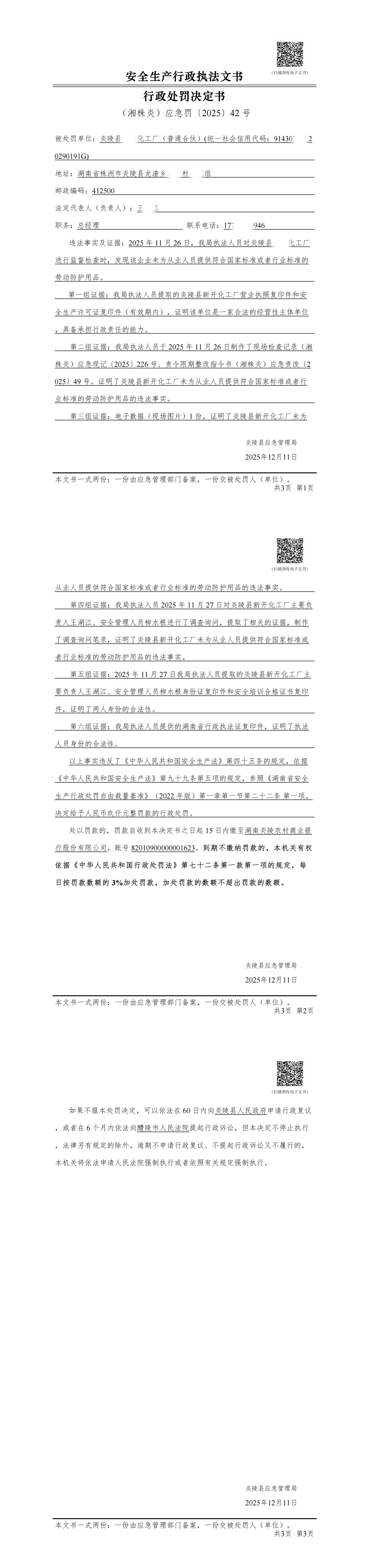 炎陵县应急管理局行政处罚决定书(湘株炎)应急罚〔2025〕42号
