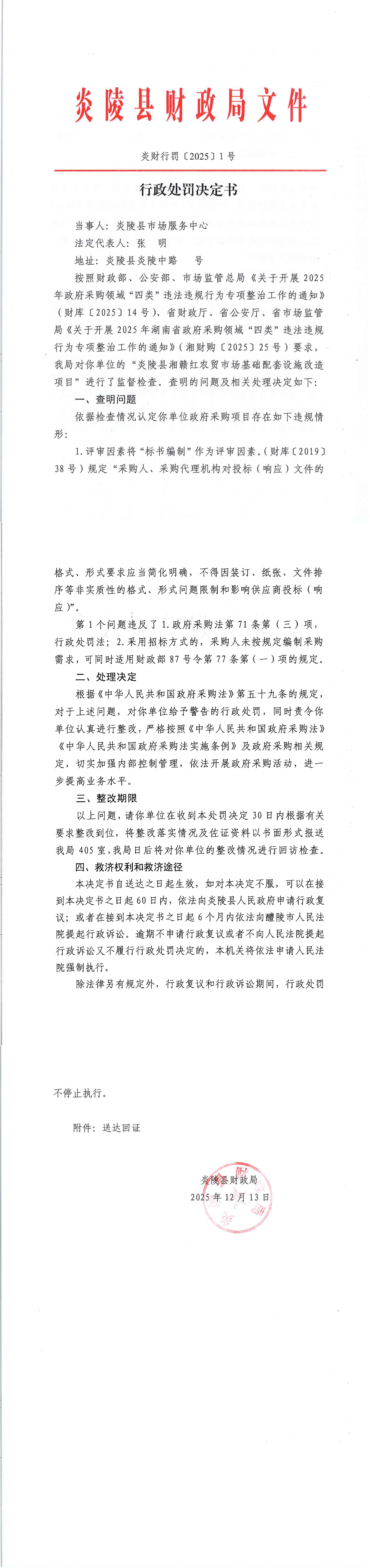炎陵县财政局行政处罚决定书炎财行罚〔2025〕1号