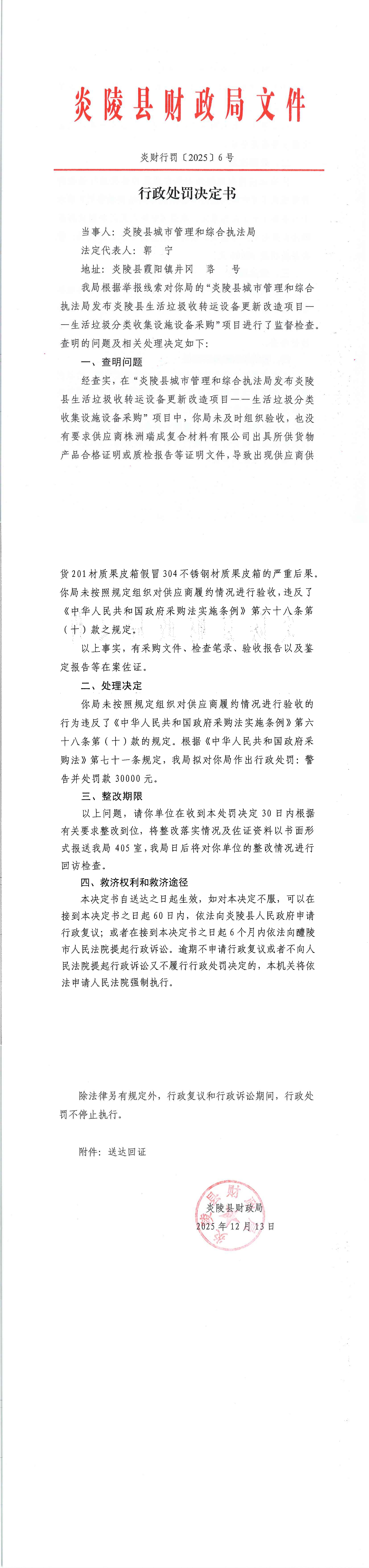 炎陵县财政局行政处罚决定书炎财行罚〔2025〕6号