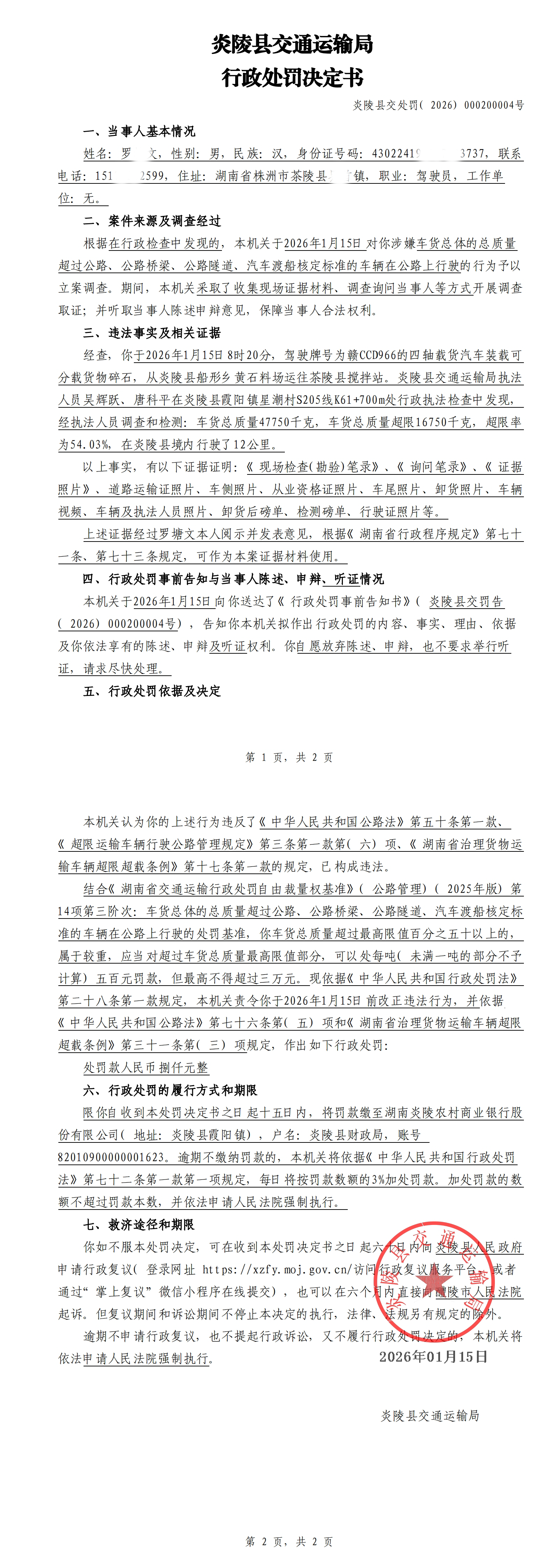 炎陵县交通运输局行政处罚决定书炎陵县交处罚〔2026〕000200004号