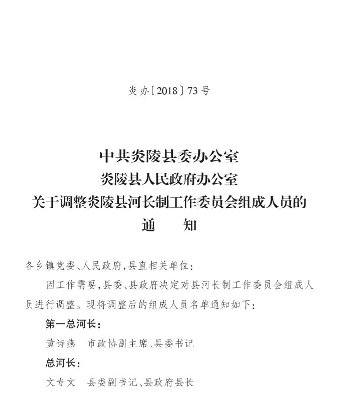 请下载附件:炎办〔2018〕73号_关于调整炎陵县河长制工作委员会组成人员