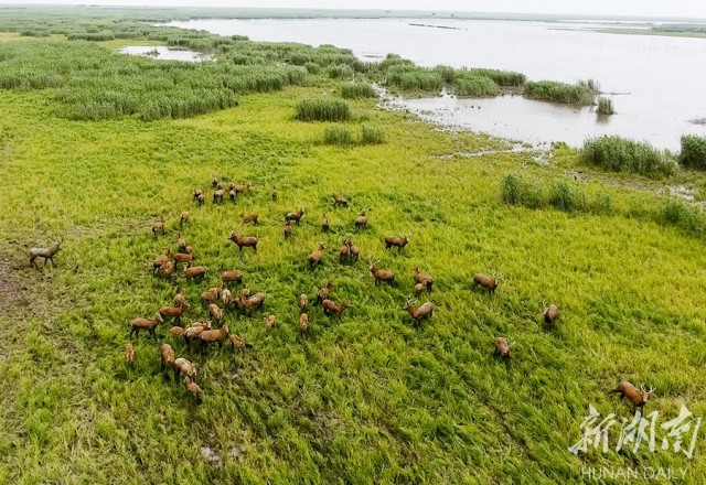 2017年5月4日,岳阳市东洞庭湖注滋河口区域,一群野生麋鹿在觅食嬉戏。随着洞庭湖生态治理力度的加大,生态环境改善明显,目前,洞庭湖区自然野化麋鹿已增至约120头。 湖南日报记者 徐典波 通讯员 张鸿 摄