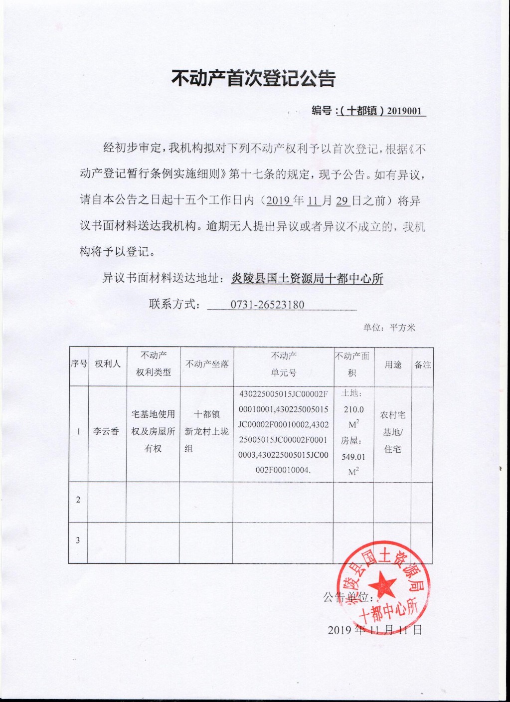 李云香--不动产首次登记公告