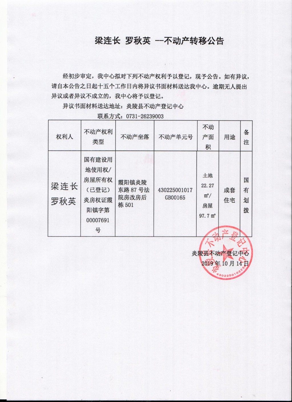 梁连长 罗秋英--不动产转移公告