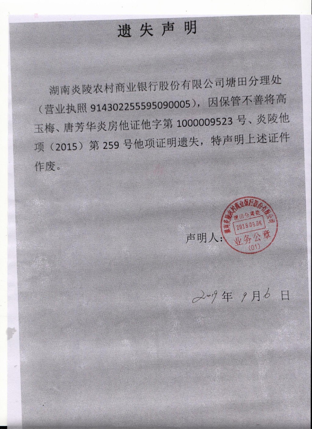 湖南炎陵农村商业银行股份有限公司塘田分理处---高玉梅、唐芳华他项遗失声明