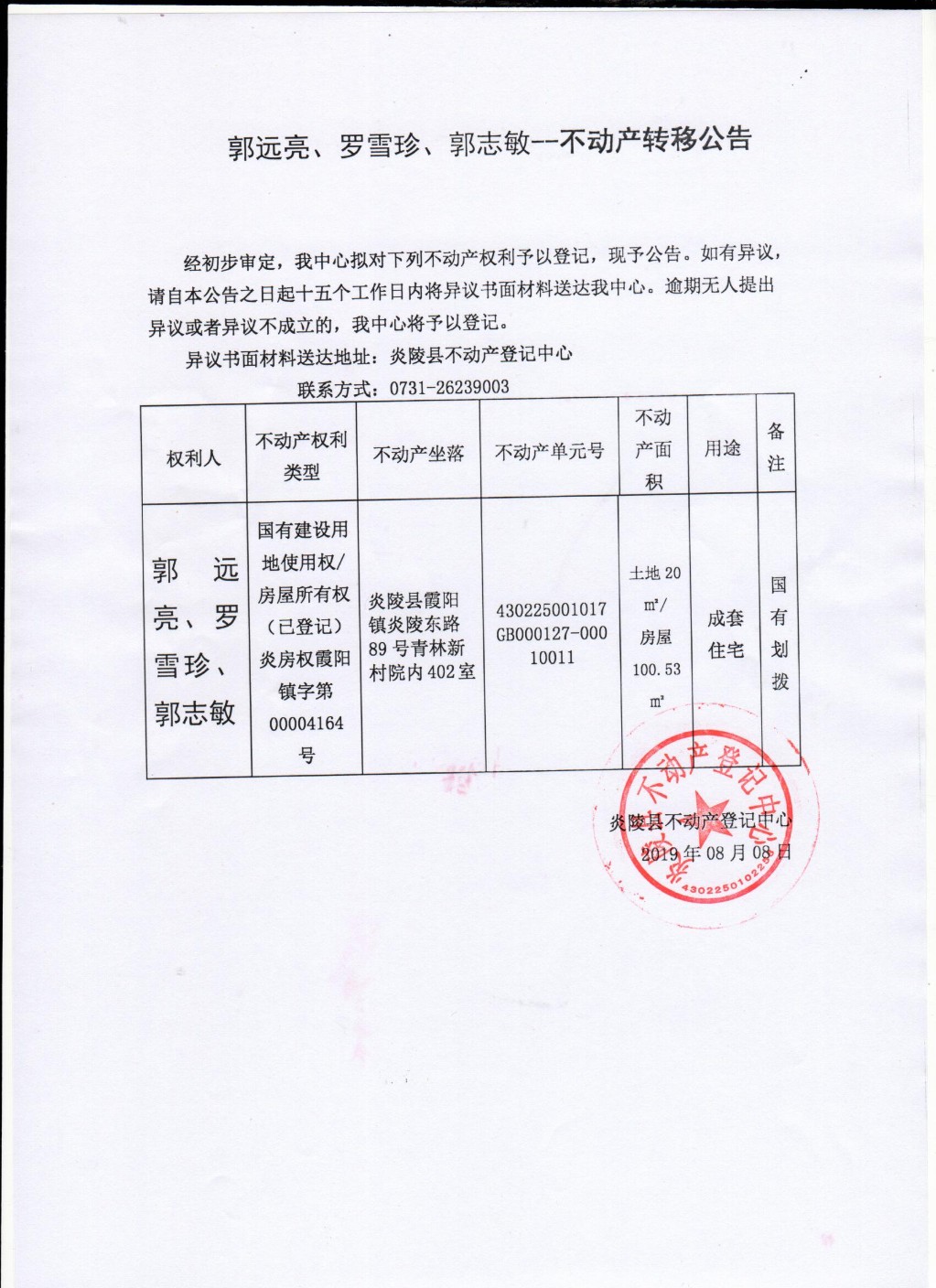 郭远亮、罗雪珍、郭志敏——不动产转移公告