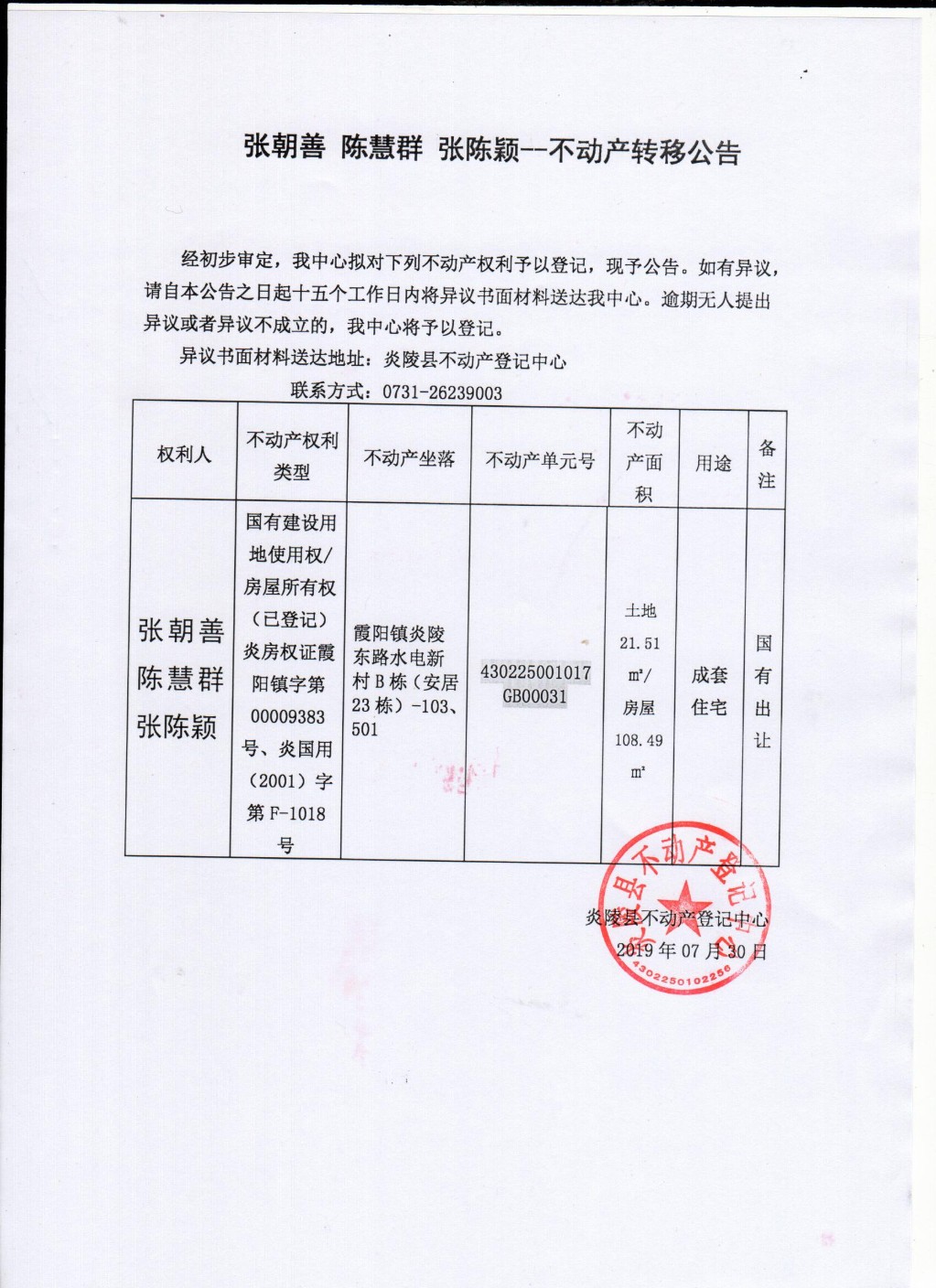 张朝善 陈慧群 张陈颖--不动产转移公告