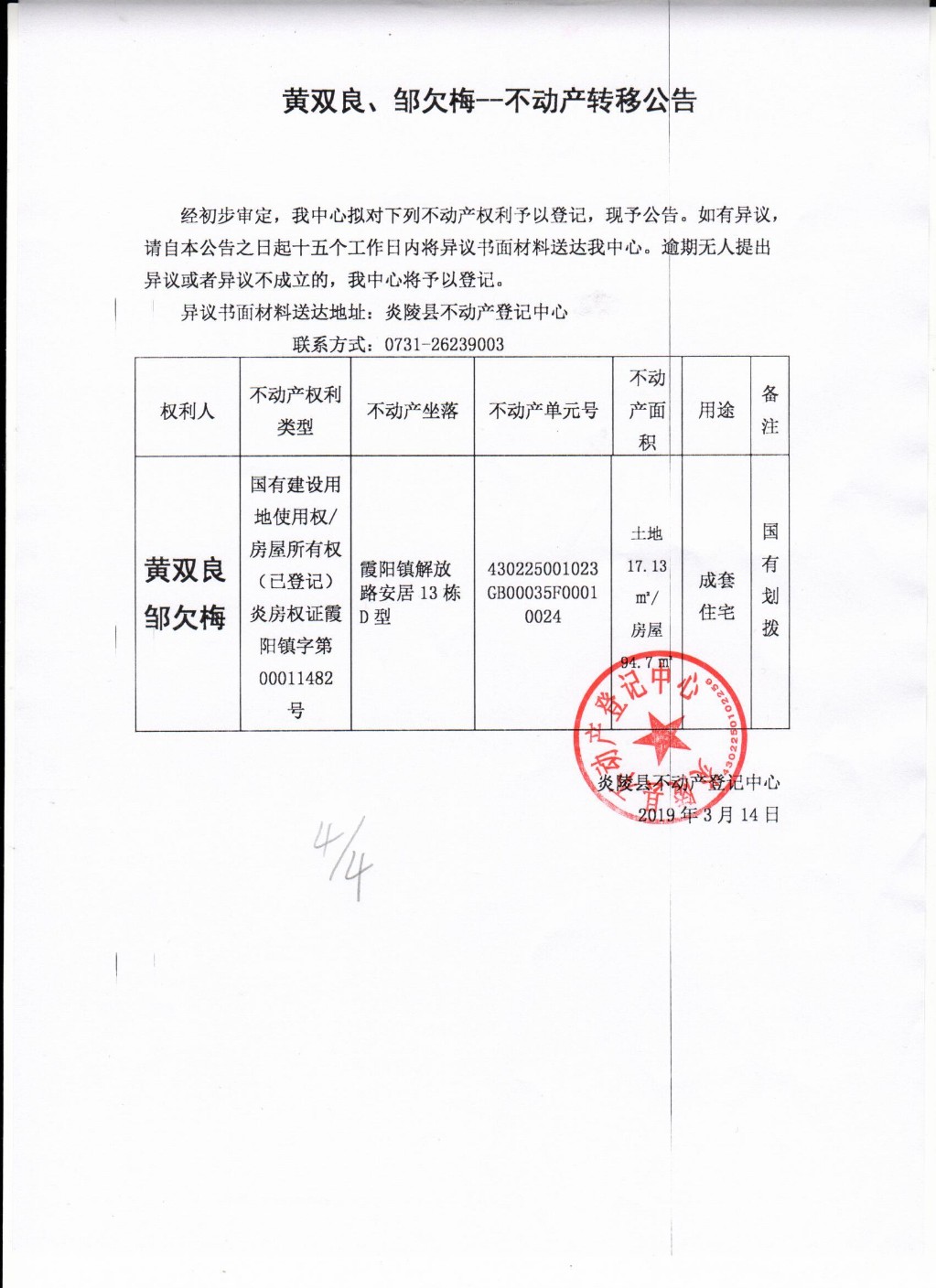 黄双良、邹欠梅不动产转移公告