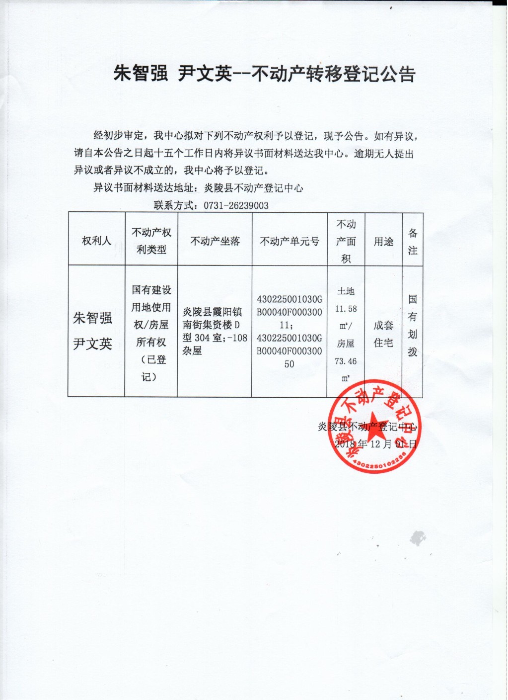 朱智强 尹文英转移登记公告