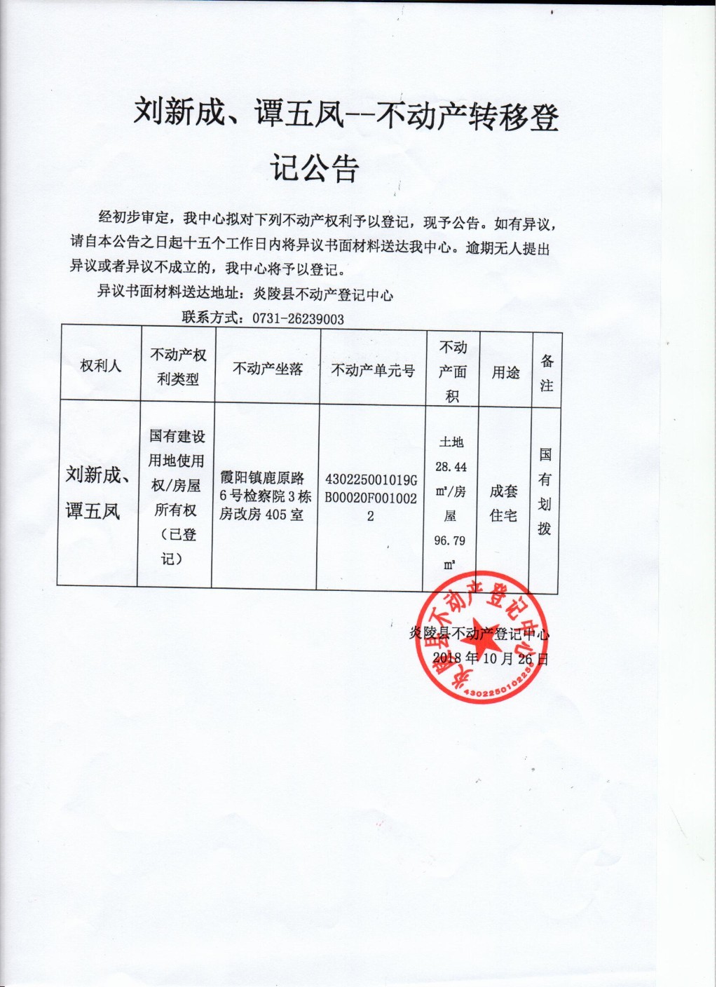 刘新成、谭五凤--不动产转移公告