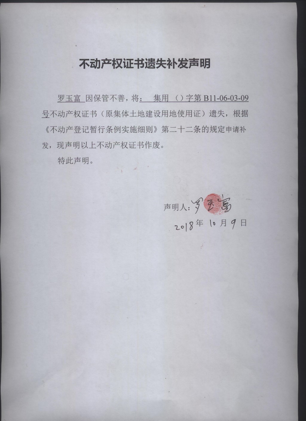 罗玉富-不动产权证书遗失补发声明