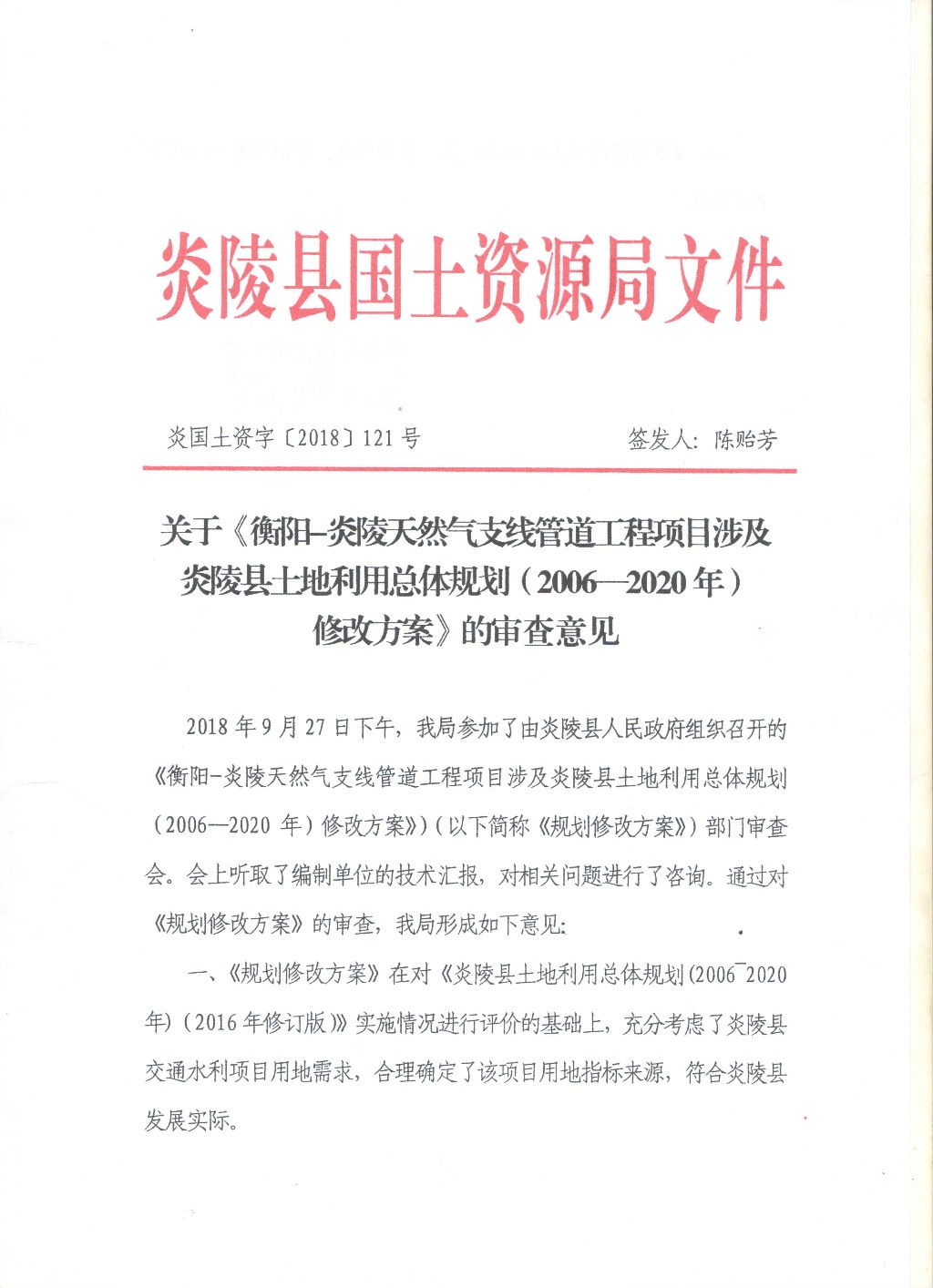 关于《衡阳-炎陵天然气支线管道工程项目涉及炎陵县土地利用总体规划(2006-2020年)修改方案》的审查意见