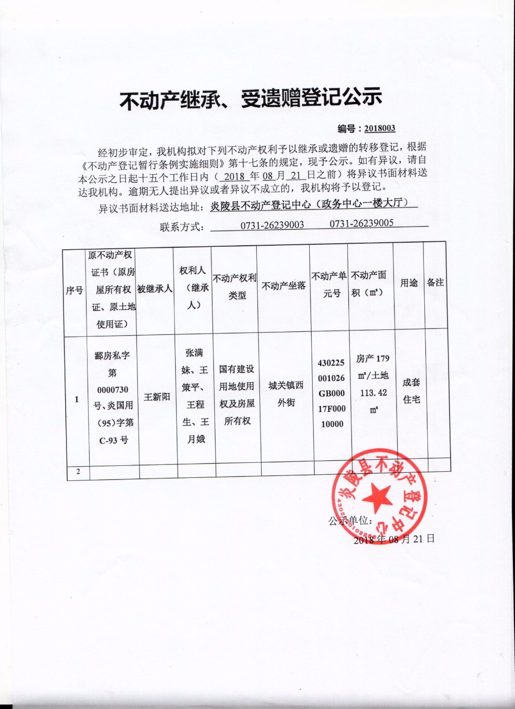 张满妹、王策平、王程生、王月娥——不动产继承公告