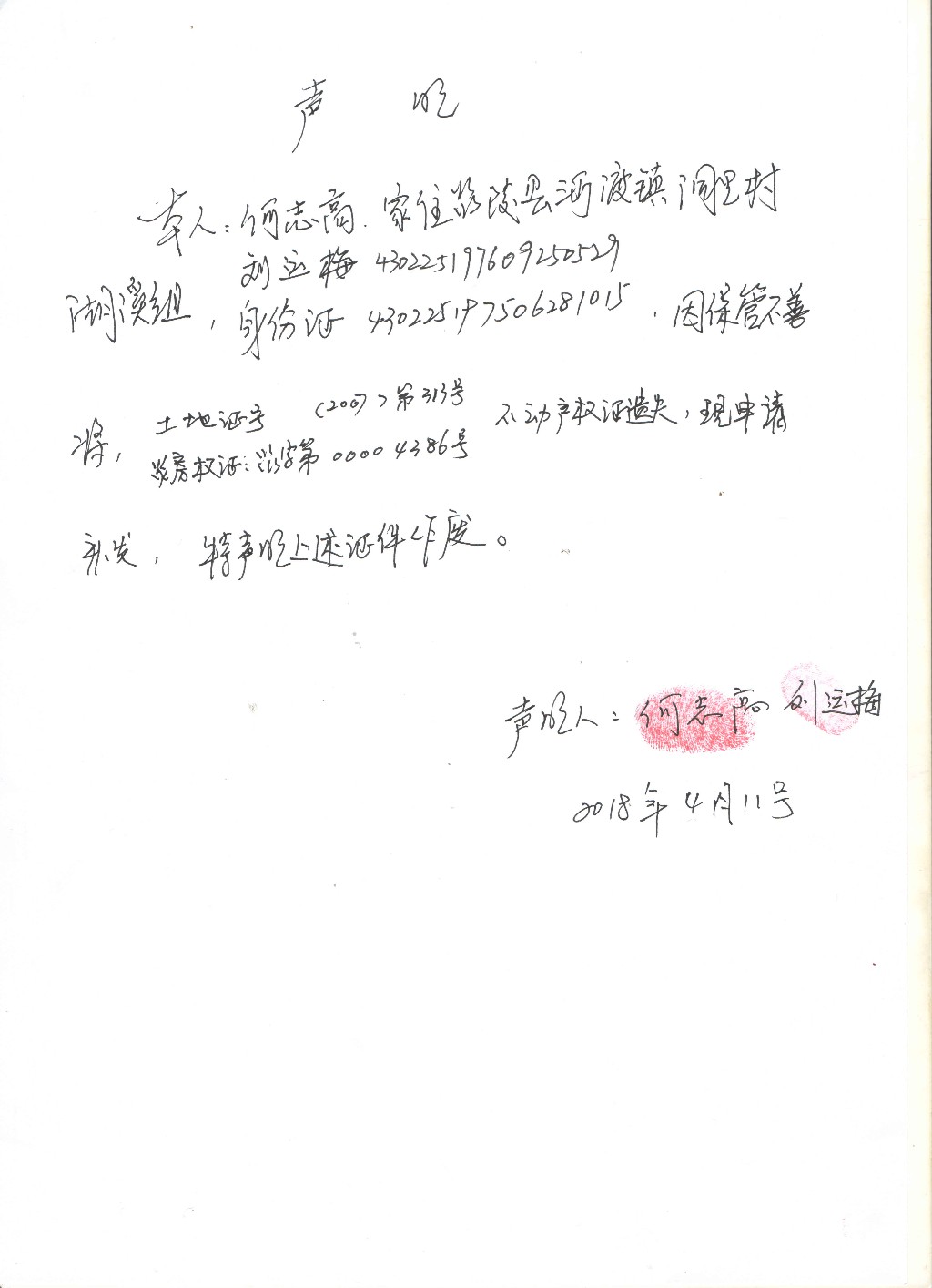 何志高、刘运梅-不动产权证遗失声明