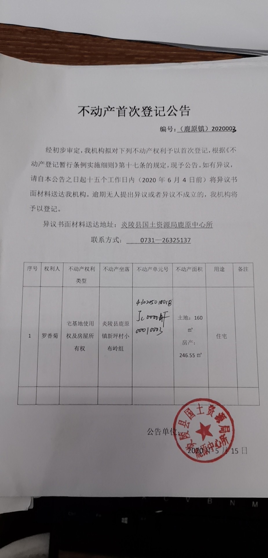 罗香菊不动产权首次登记公告