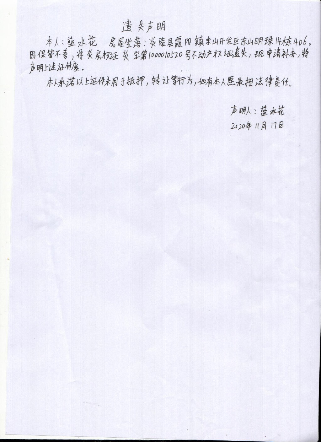 蓝水花不动产权证遗失声明