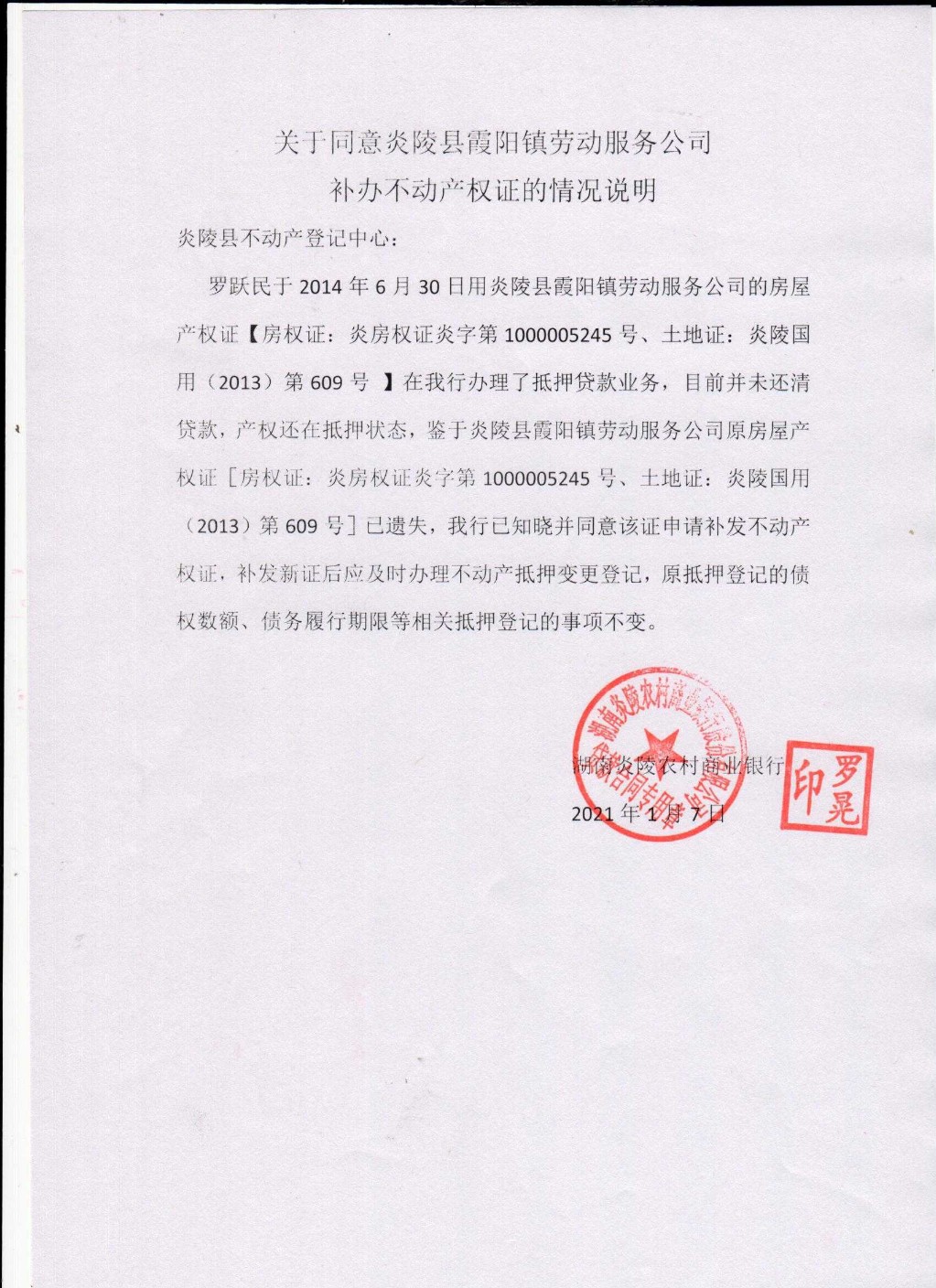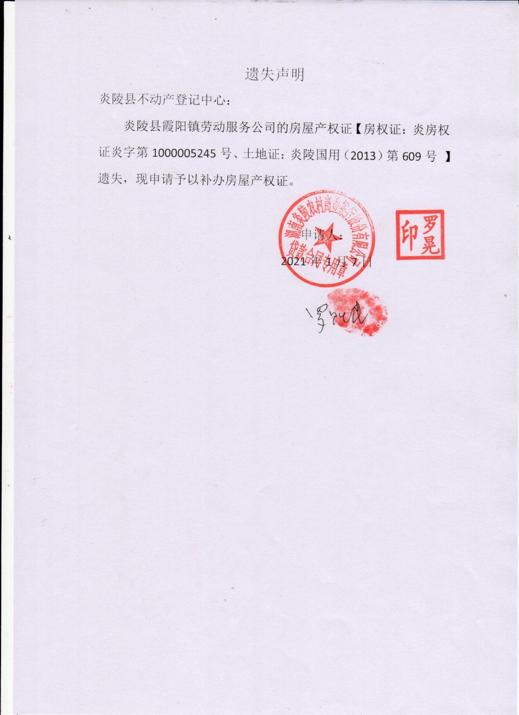 炎陵县霞阳镇劳动服务公司不动产证遗失公告
