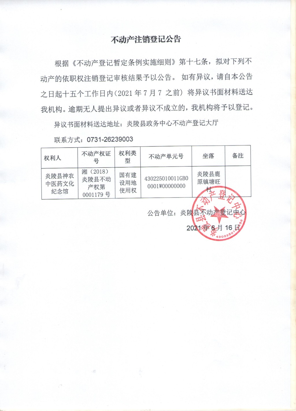 不动产注销登记公告-炎陵县神农中医药文化纪念馆