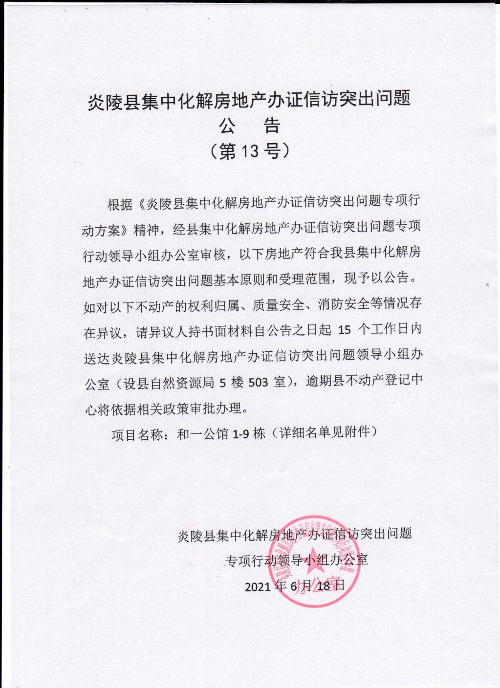 炎陵县集中化解房地产办证信访突出问题公告(13号)、和一公馆1-9栋