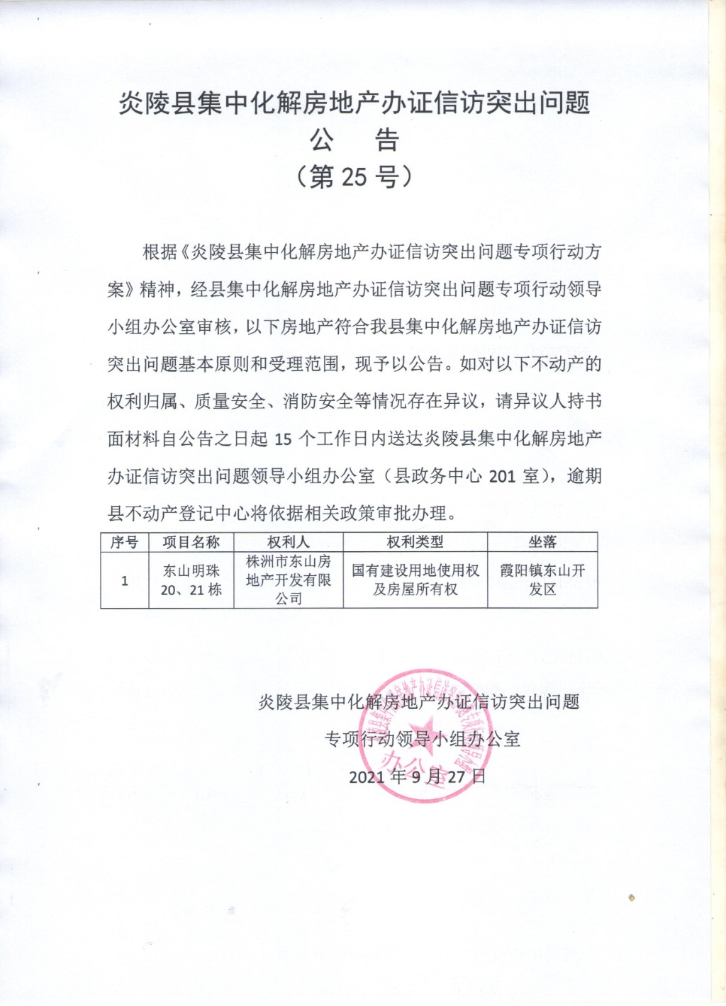 炎陵县集中化解房地产办证信访突出问题公告(第25号)