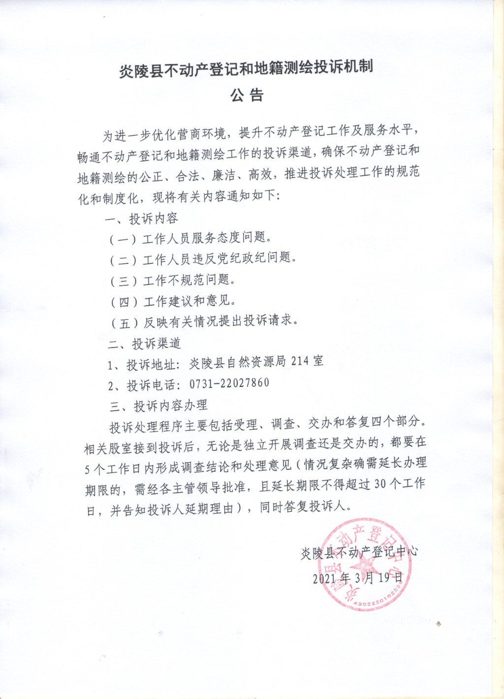 炎陵县不动产登记和地籍测绘投诉机制公告