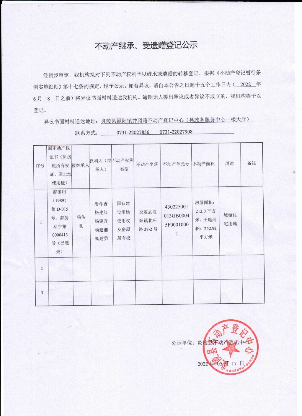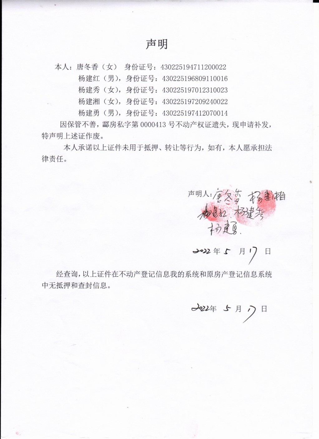 杨建勇、唐冬香、杨建湘、杨建红、杨建秀不动产继承、遗失公告