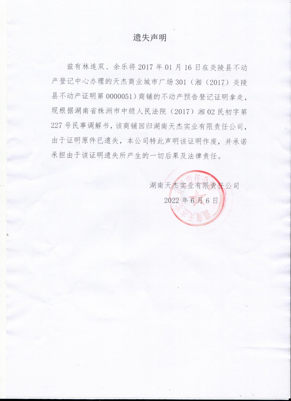 余乐、林连双不动产证明遗失声明