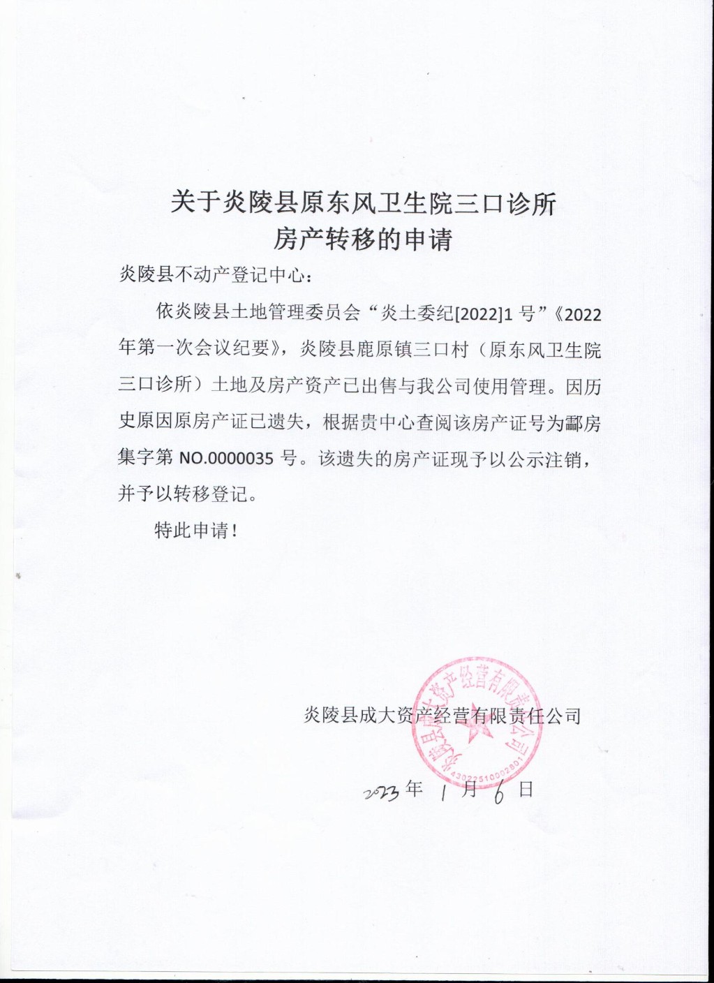 关于炎陵县原东风卫生院三口诊所房产证--遗失声明