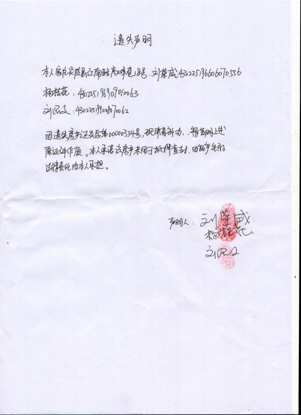 房产证遗失声明-刘荣咸 杨桂花 刘依文
