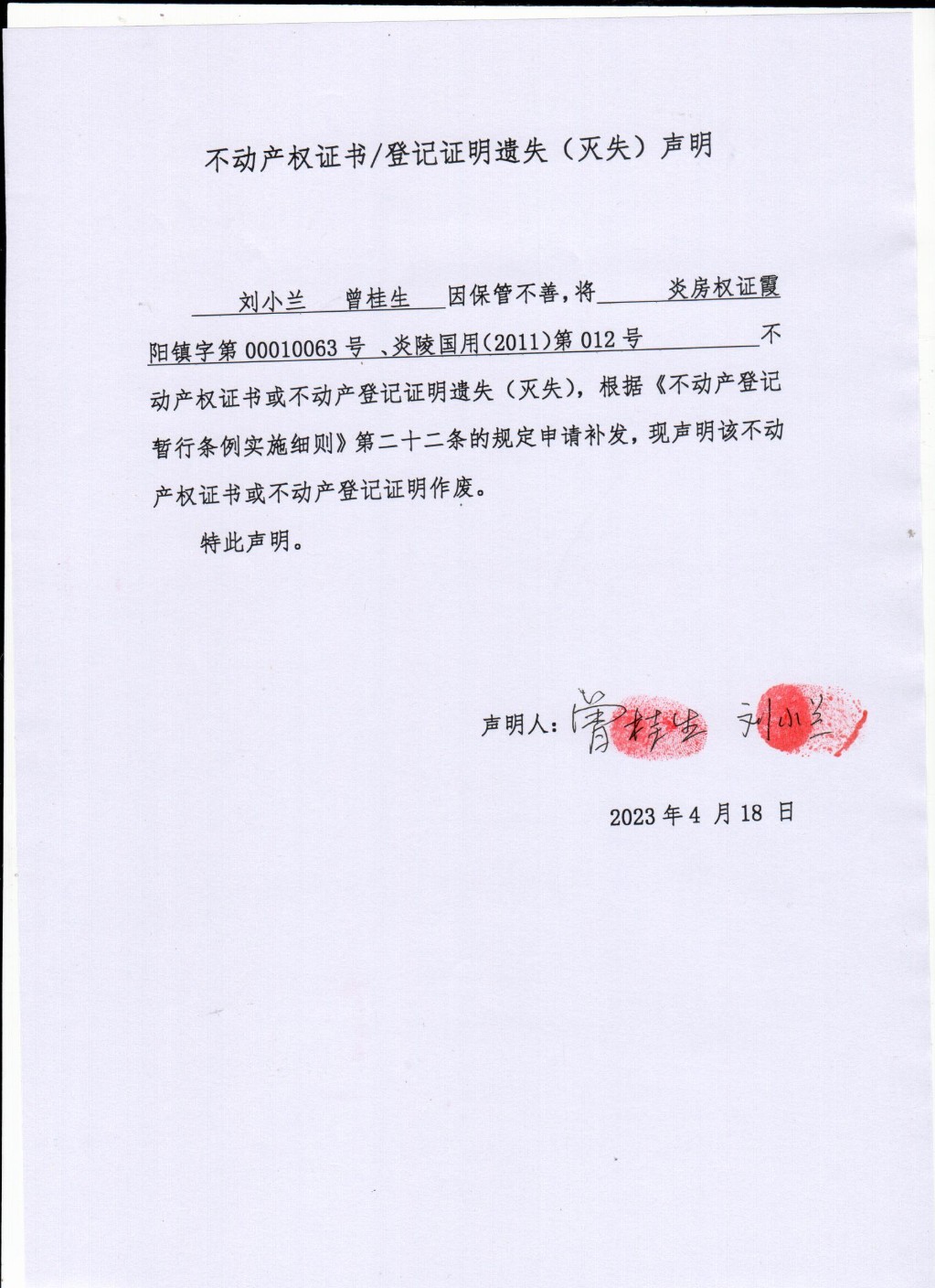 房产证和土地证遗失声明-刘小兰 曾桂生