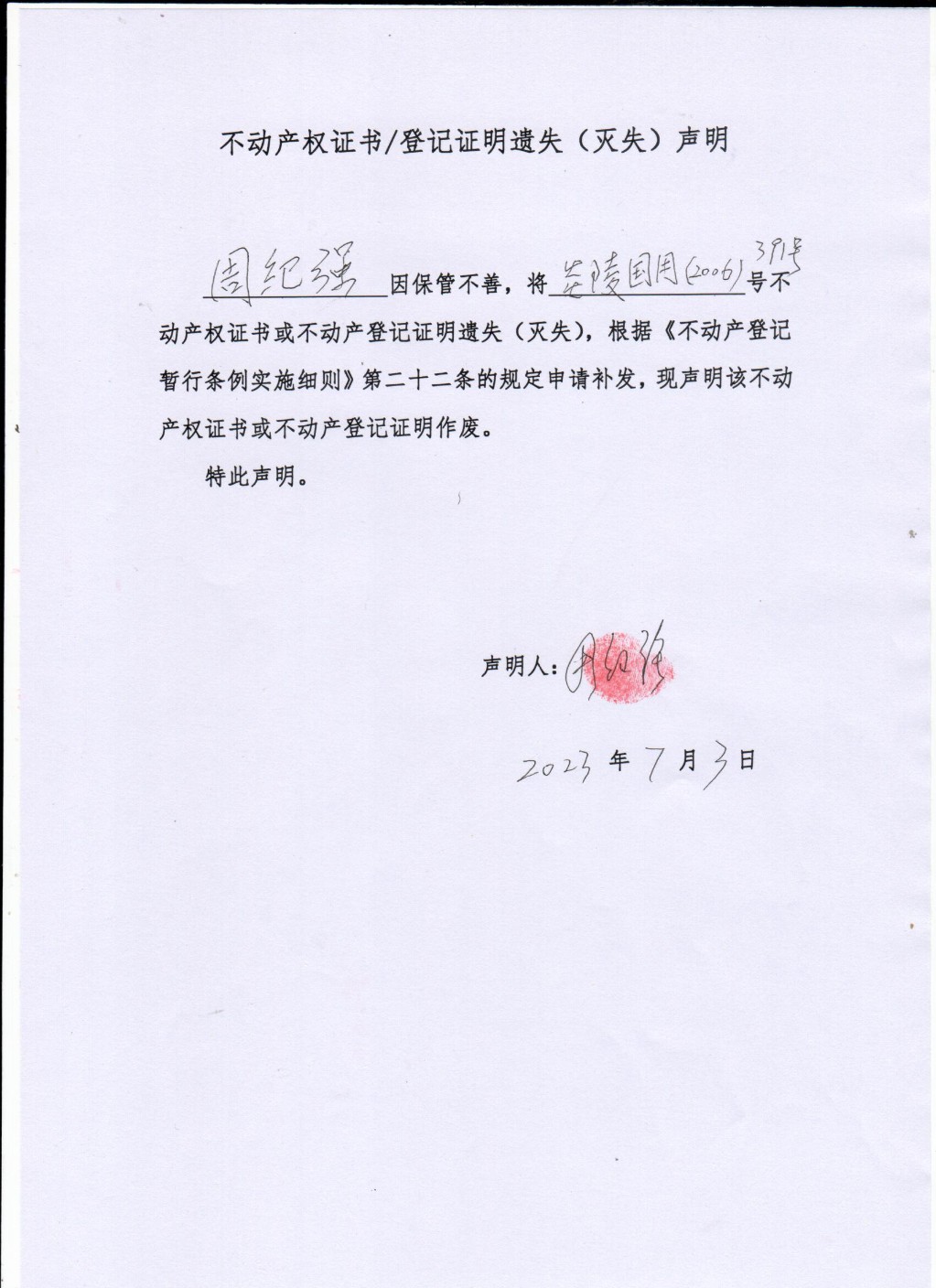 周纪强——不动产证遗失补证公示