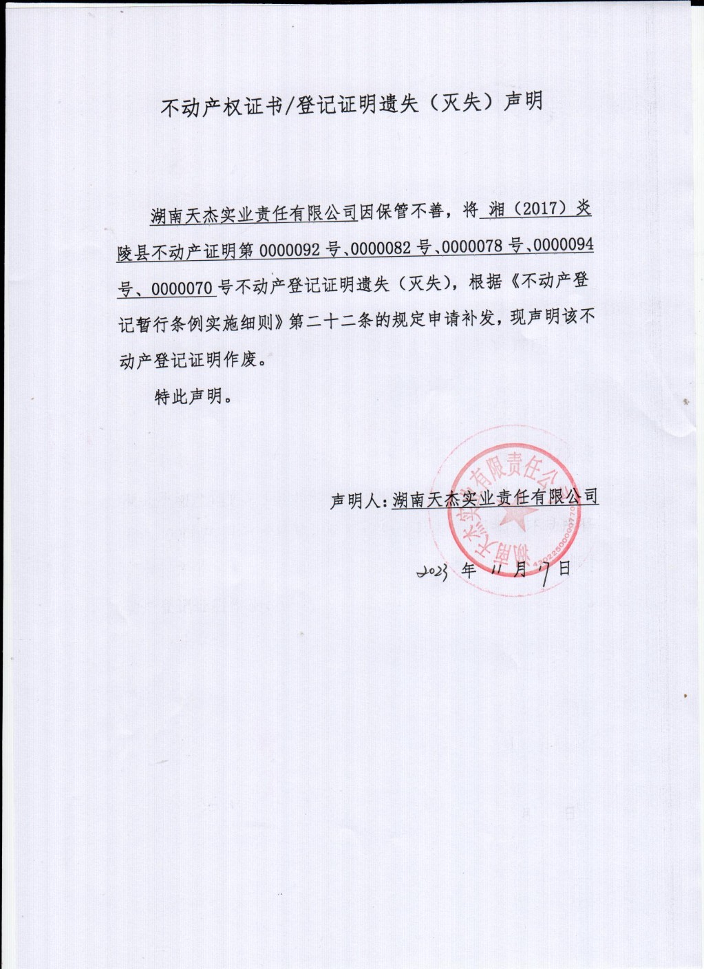 湖南天杰实业责任有限公司不动产证明遗失公示