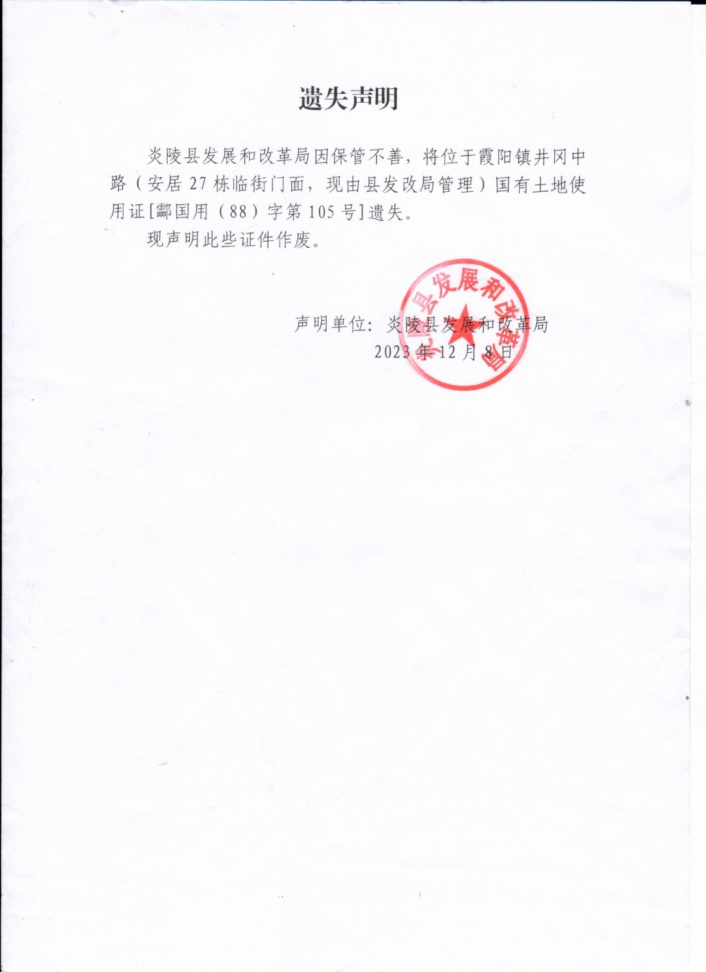 炎陵县发展和改革局--遗失声明