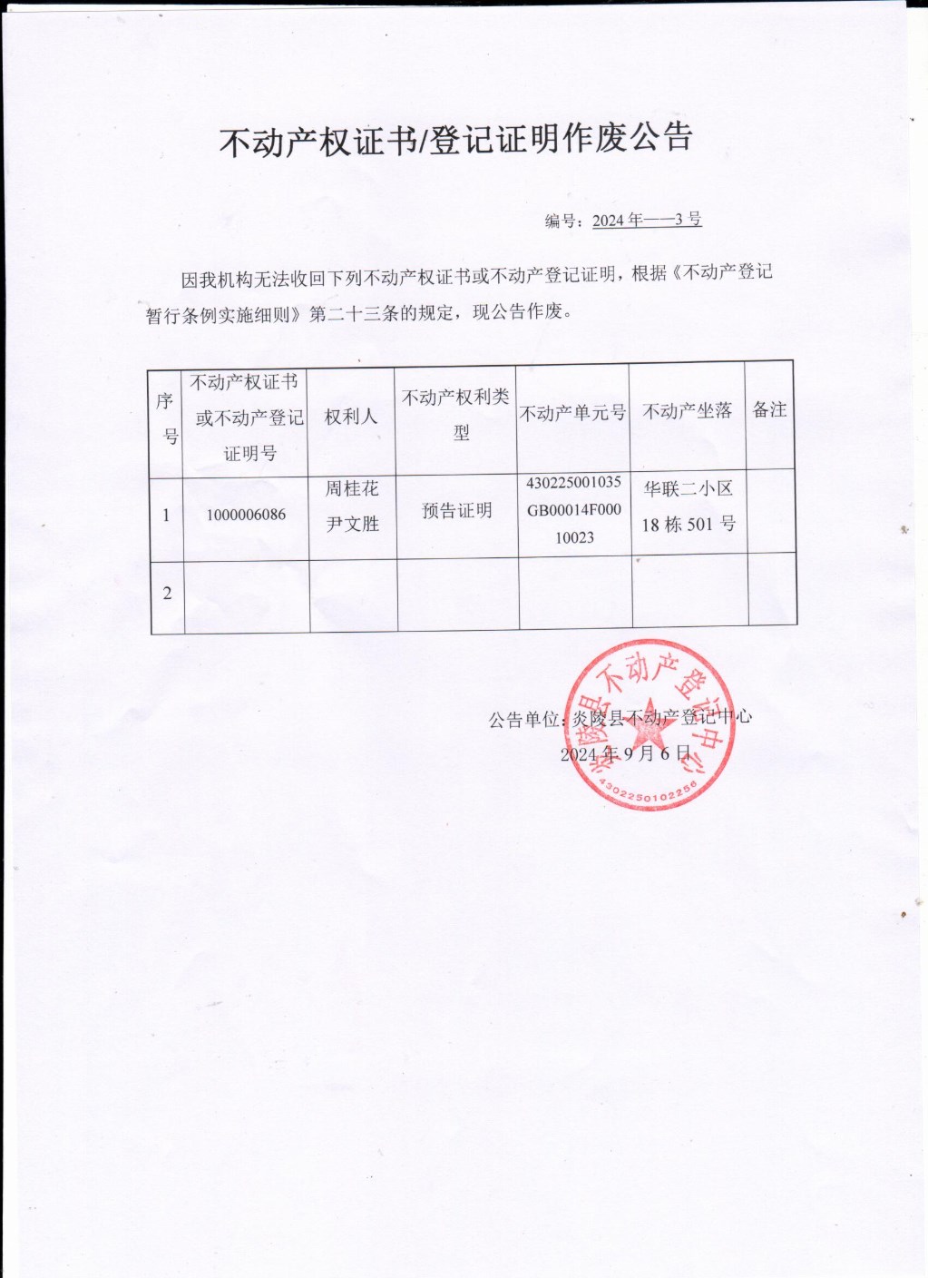 周桂花、尹文胜黄颖--不动产预告证明作废公告