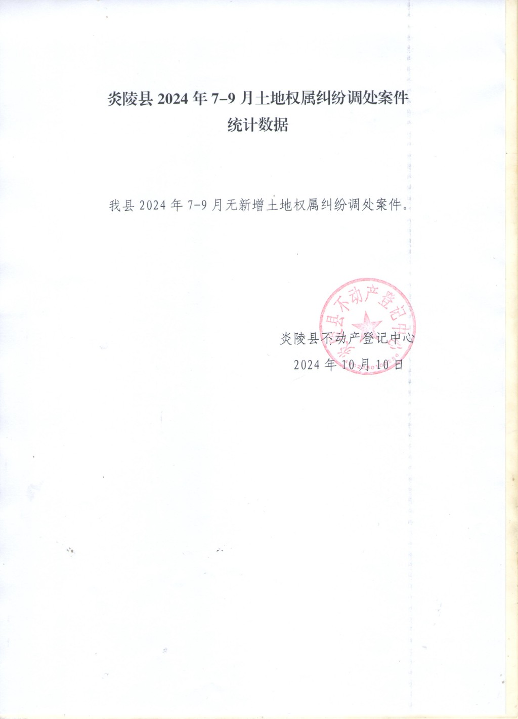 炎陵县2024年7-9月土地权属纠纷调处案件统计数据