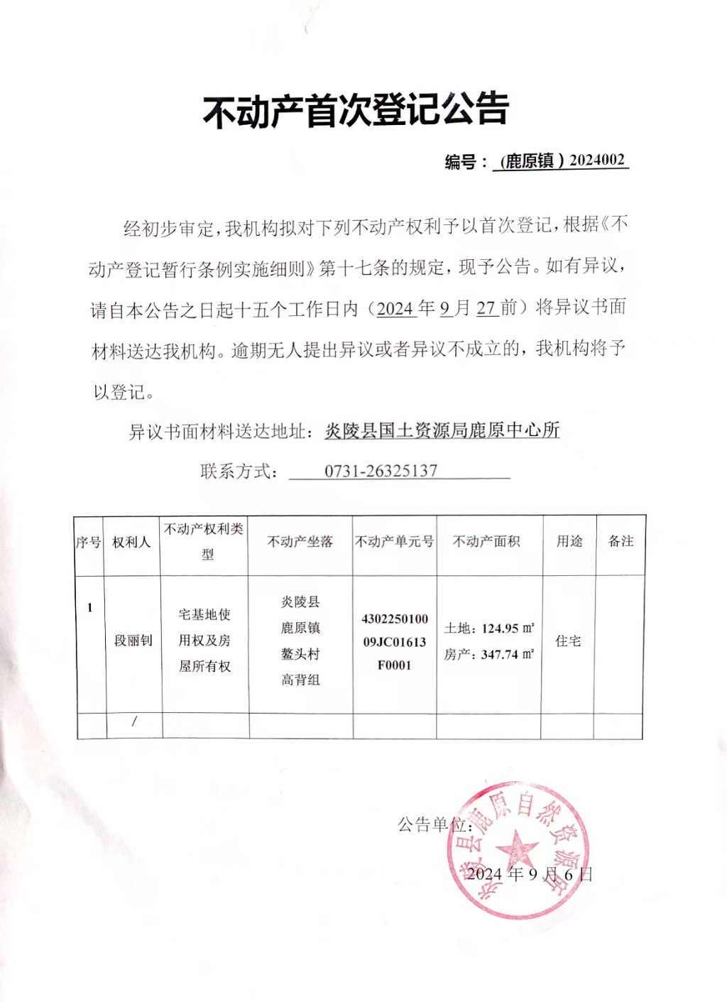 段丽钊 ——不动产权证书首次登记公告