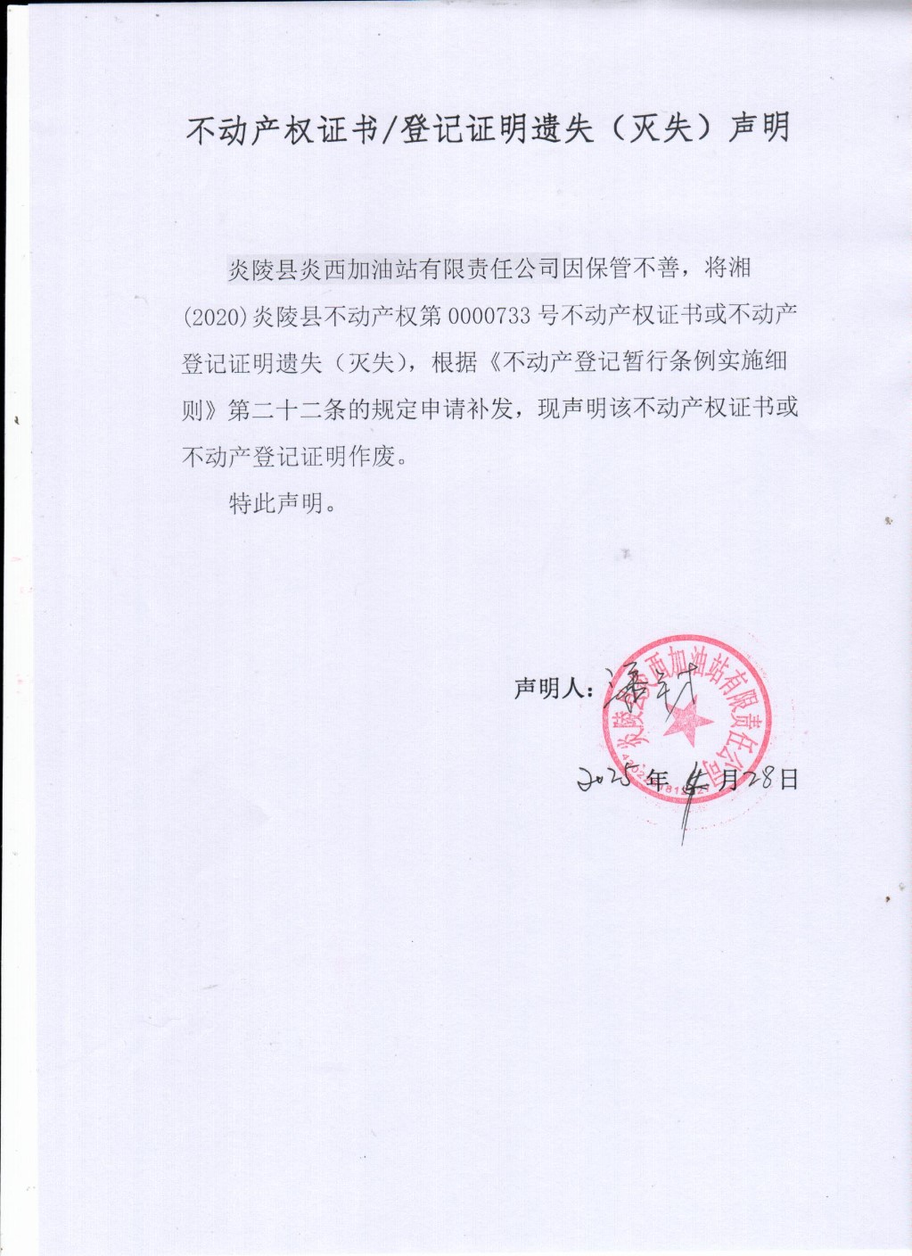 炎陵县炎西加油站有限责任公司不动产权证遗失声明