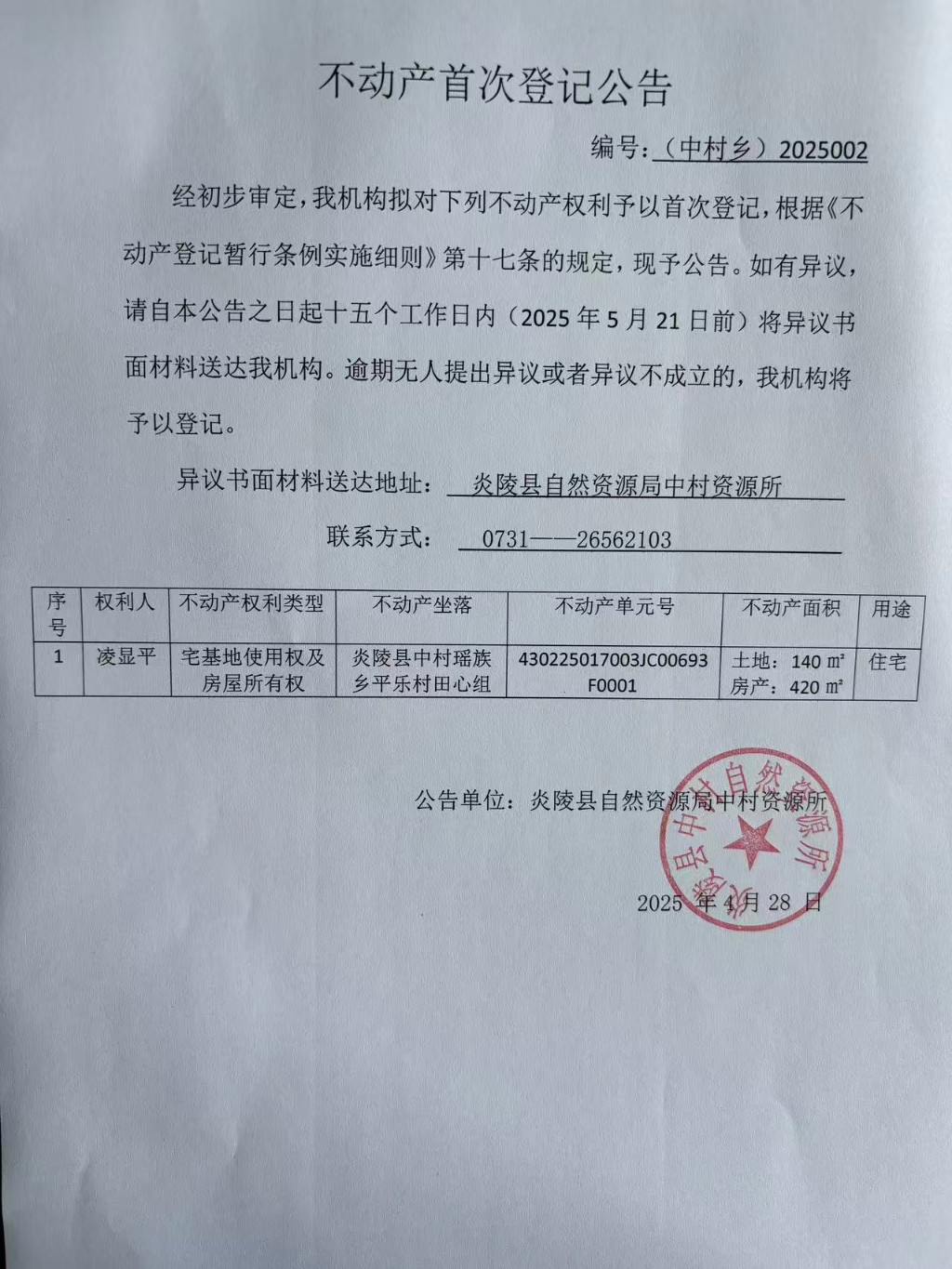 凌显平——不动产权证书首次登记公告