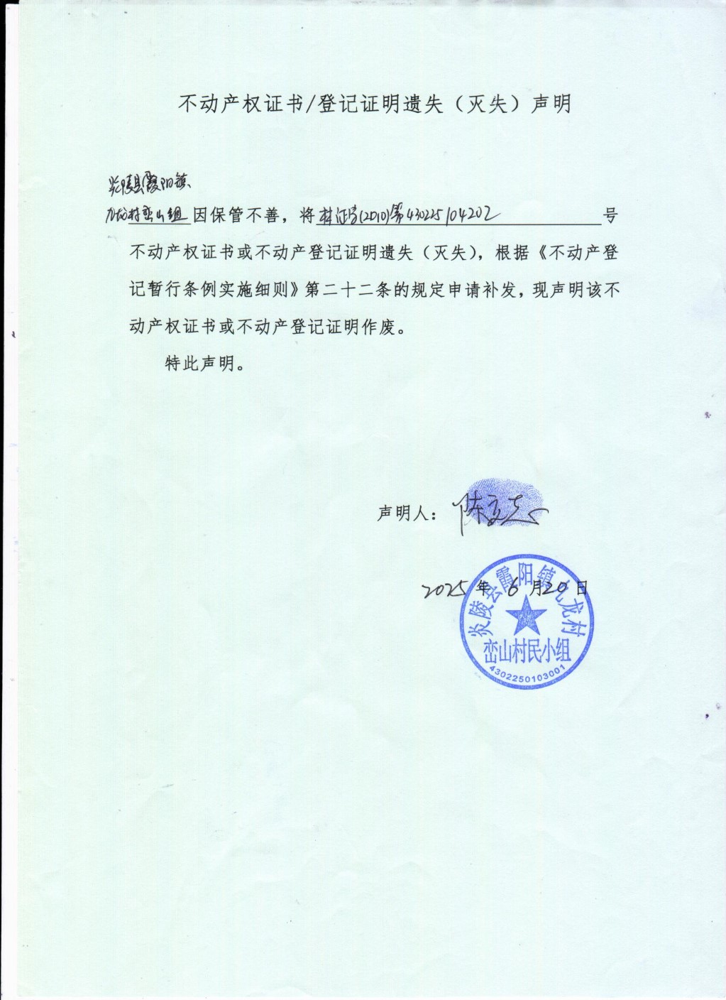 炎陵县霞阳镇九龙村峦山组林权证遗失公告