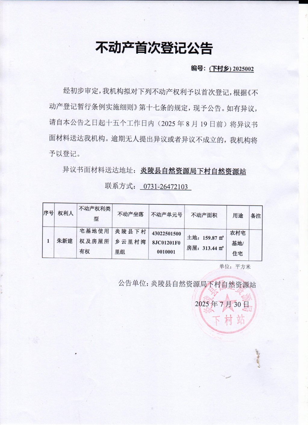 朱新建不动产权证书首次登记公告
