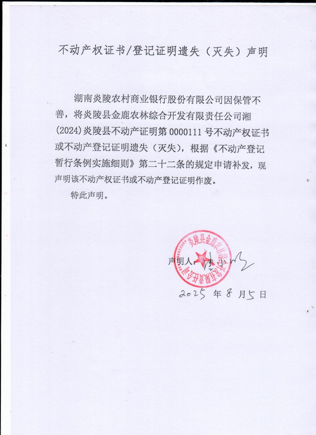炎陵县金鹿农林综合开发有限责任公司不动产证明遗失声明