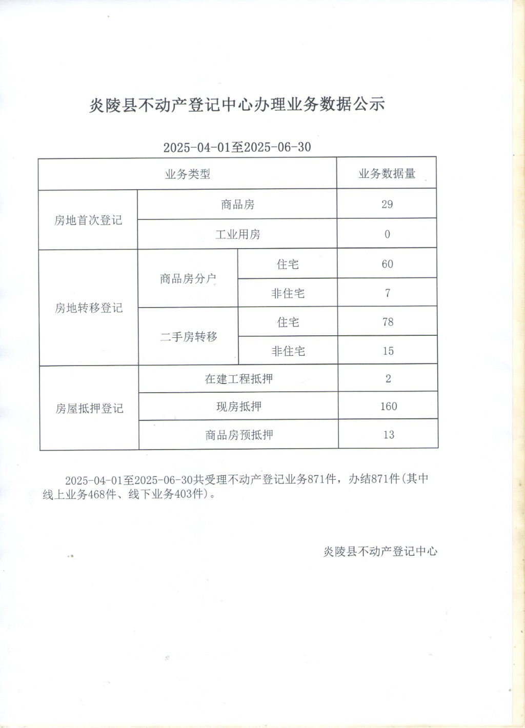 炎陵县不动产登记中心2025年4-6月办理业务数据公示