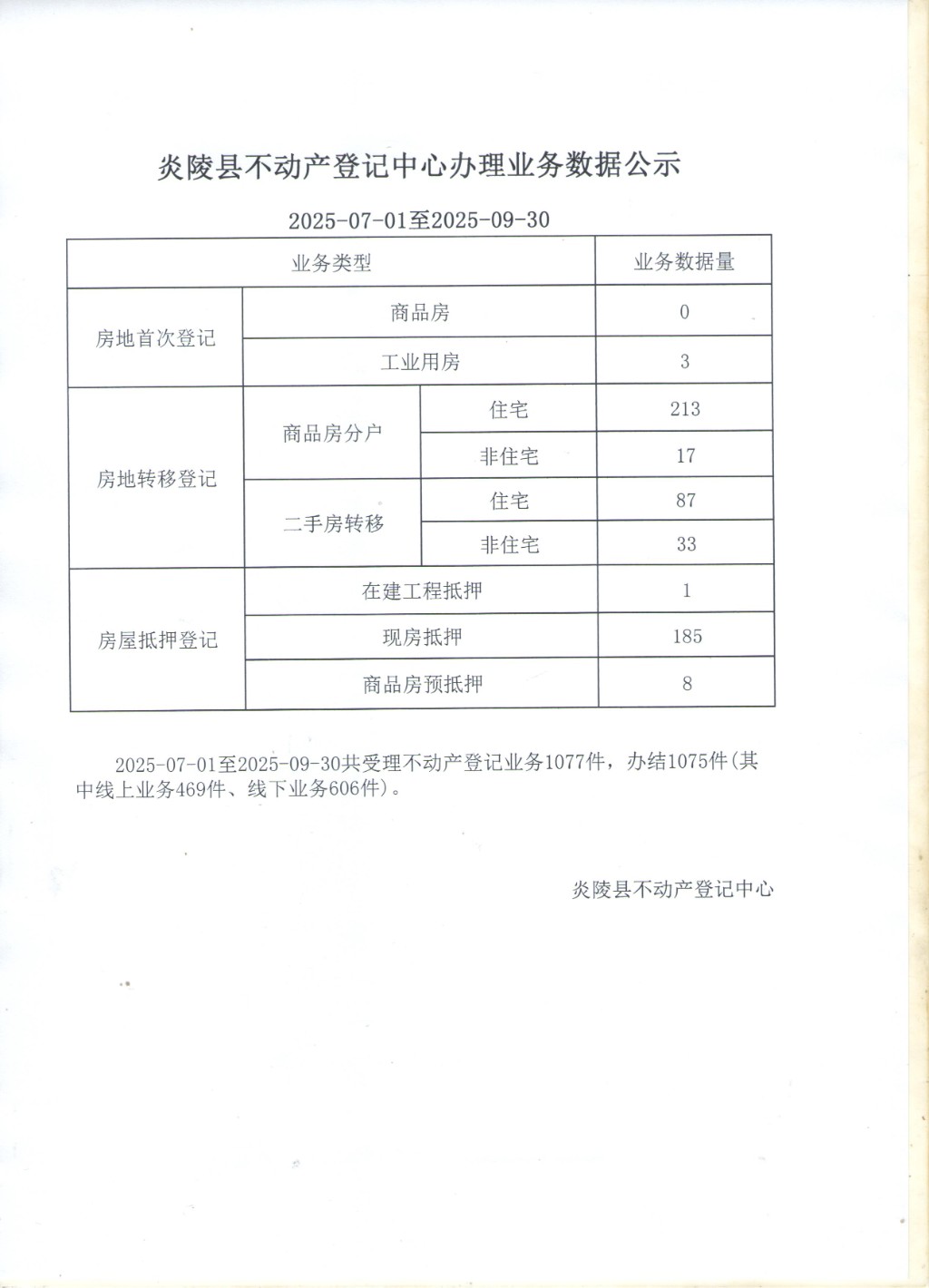 炎陵县不动产登记中心2025年7-9月办理业务数据公示