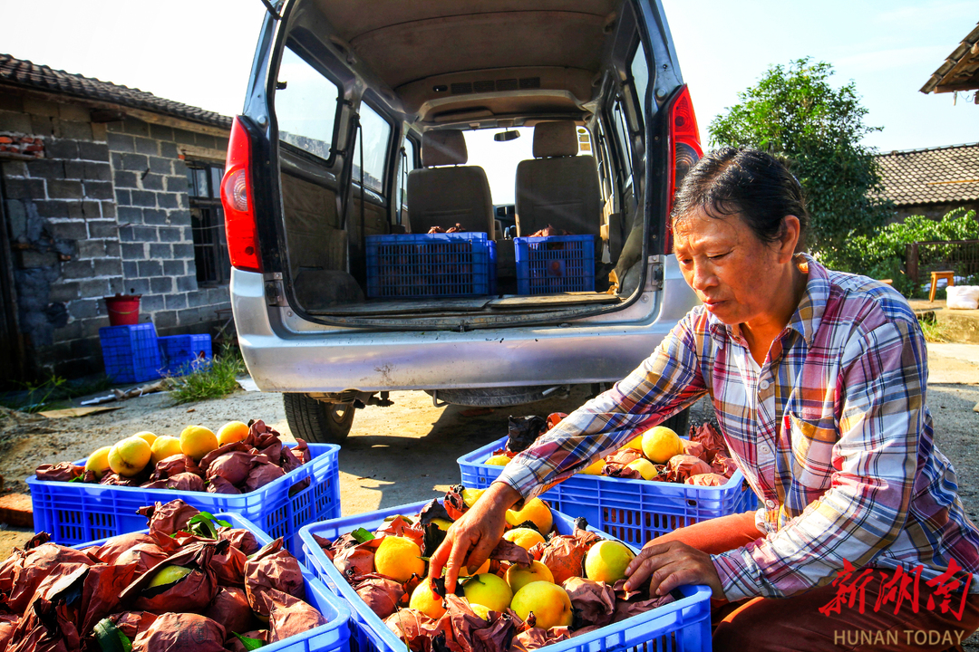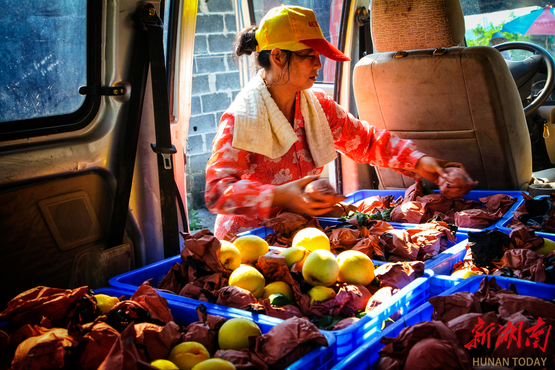 8月22日,炎陵县中村瑶族乡鑫山村,村民陈丽萍忙着打包装箱一批晚熟高山黄桃。今年,她家共采摘黄桃5.5万公斤,销售额60余万元。