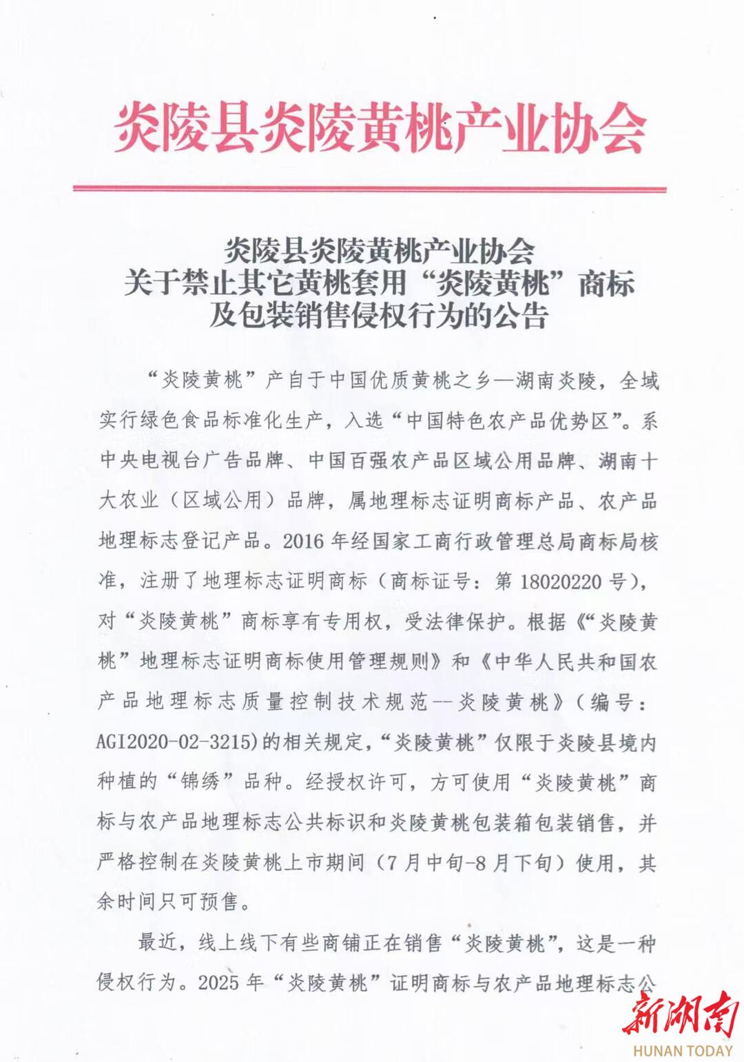 [湖南日报]炎陵黄桃产业协会发布公告:非炎陵产区、非上市期使用商标包装均属侵权