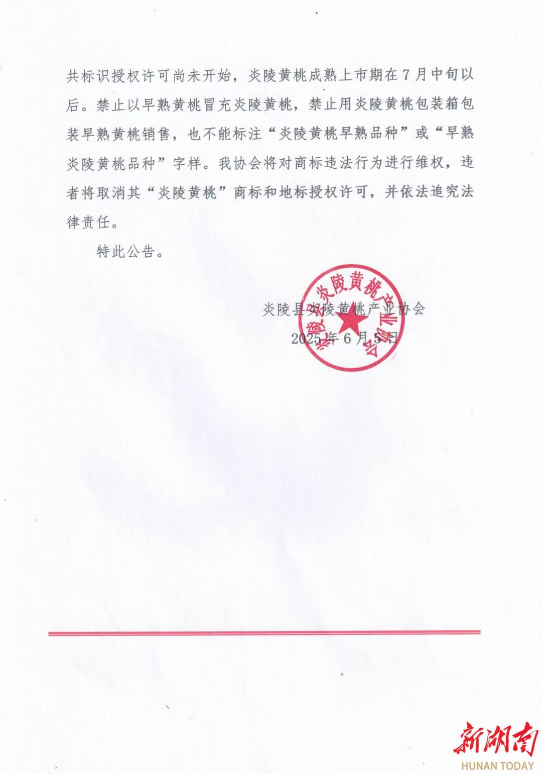 湖南日报·新湖南客户端6月8日讯(记者 张咪 通讯员 张和生)炎陵县炎陵黄桃产业协会近日发布公告,严正声明:非炎陵本地种植、非规定上市季节使用“炎陵黄桃”商标及其专属包装进行销售的行为,均属违法侵权,协会将依法追究责任。