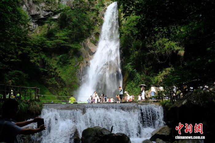 炎炎夏日,湖南省株洲市炎陵县神农谷珠帘瀑布下游人如织。 唐玮婷 摄